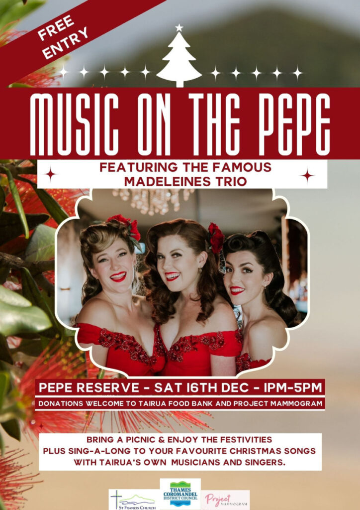 Bring the family for a picnic and enjoy seasonal music on the pepe, featuring local musicians, singers and a special visit from The Madeleines Trio Free event, but any donations on the day will go to Tairua Food Bank and Project Mammogram For more Information: https://thecoromandel.com/explore/music-on-the-pepe The Madeleines Trio: https://www.themadeleines.com/