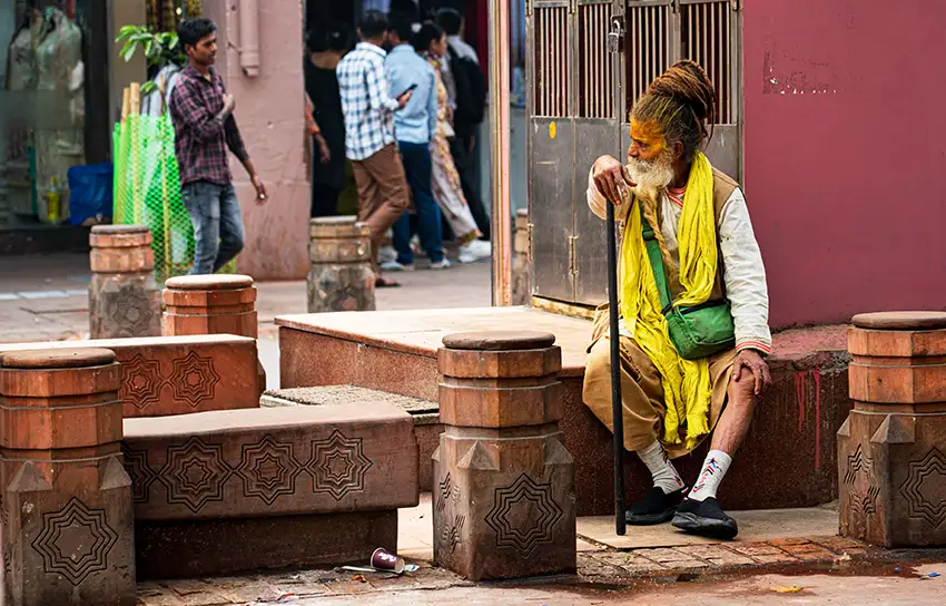 Street portrait of a Sadhu having a rest in the chaos of Old Delhi.