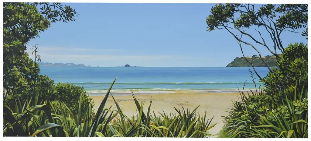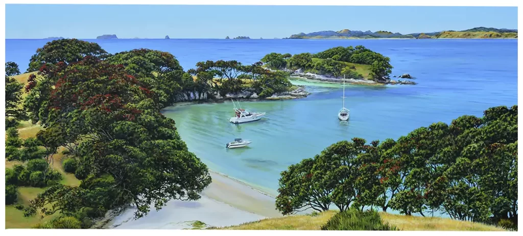 Now we spend our time between our home in Taupiri and Matarangi. Many of my paintings feature Coromandel beaches. I love the sea, so water plays a big part in my work. Beautiful boats and beaches that evoke memories. As part of the Mercury Bay Art Escape each year, and also The Gordonton Art & Design Trail in the Waikato, we open up our homes for people to visit and view my art.