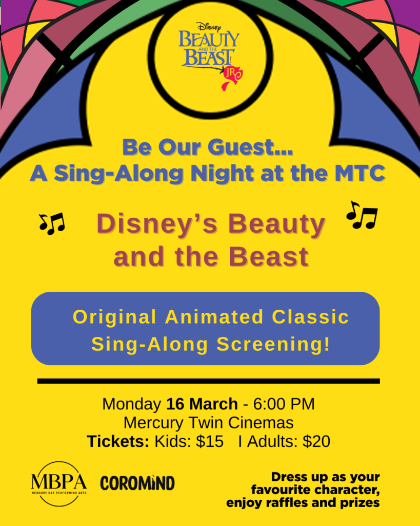 Mercury Bay Performing Arts is delighted to invite the entire community to a magical evening at the cinema. Before the young cast takes to the stage this May, MBPA is hosting a very special Sing-Along screening of the original Disney animated classic, Beauty and the Beast.