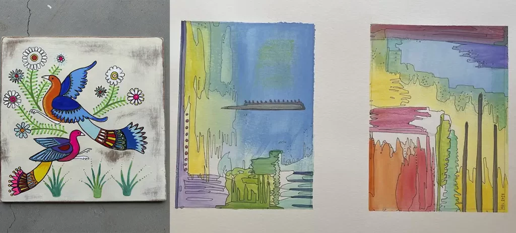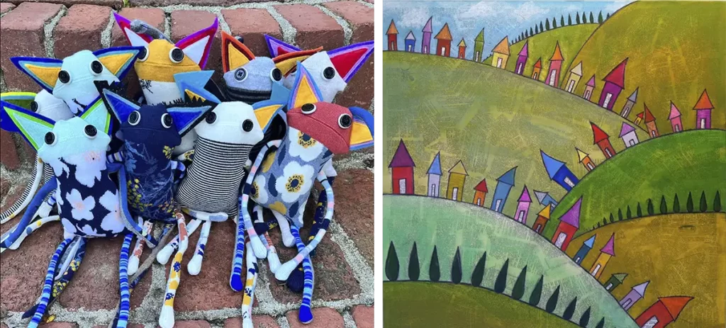 My creative practice is all over the map. Aside from my sock monstahs, I’ve painted cityscapes, done playful pet portraits, and illustrated a beer label. I make abstract paintings (a meditative and soothing pandemic practice) and I’m learning embroidery. Currently I’m working on a series of vibrant bird-and-flower paintings on wood, inspired by the Mexican folk art tradition of amate bark painting.