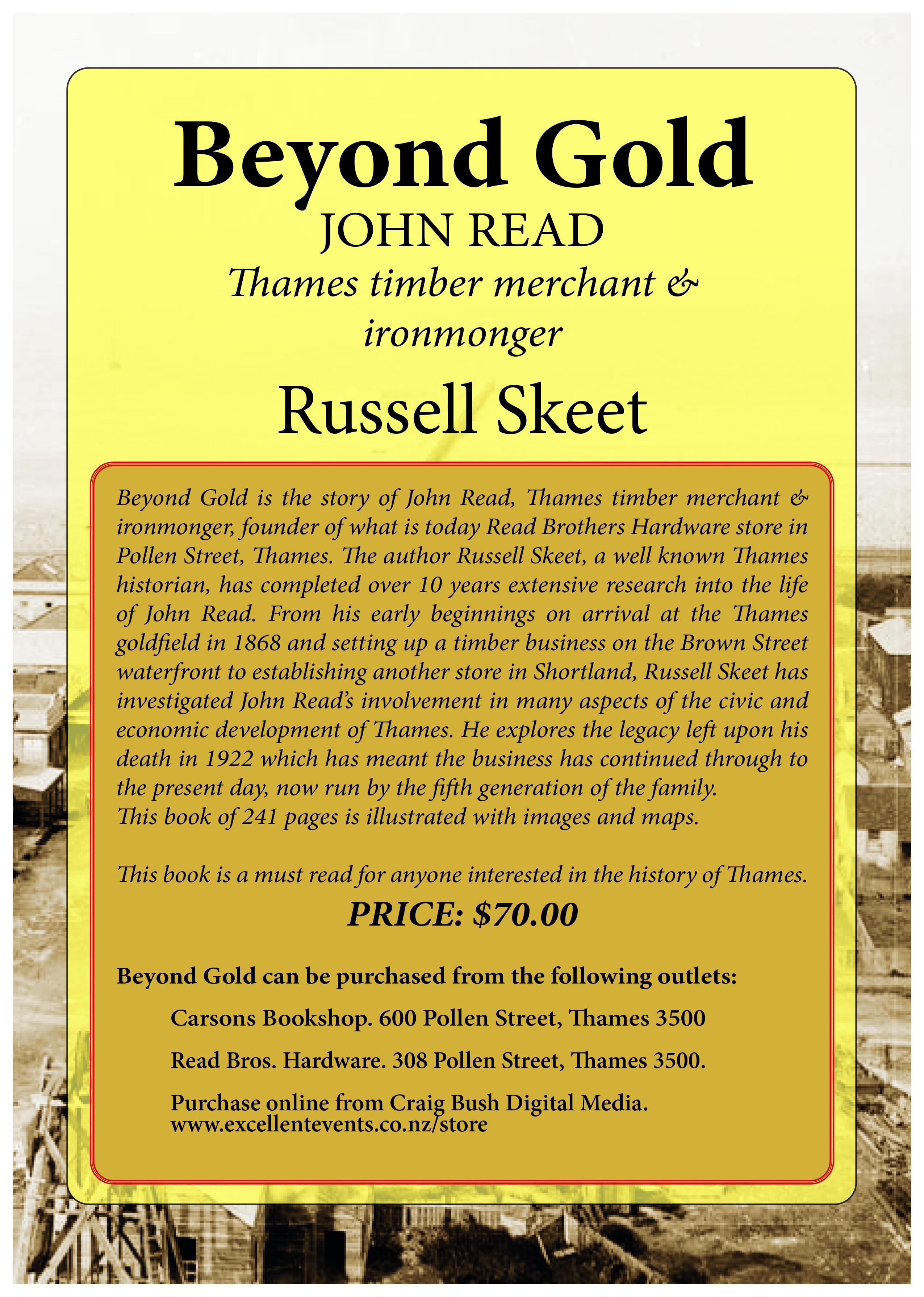 Beyond Gold can be purchased from the following outlets: Carsons Bookshop. 600 Pollen Street, Thames 3500. //. Read Bros. Hardware. 308 Pollen Street, Thames 3500.