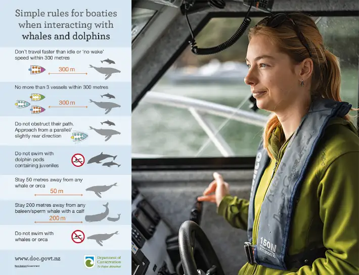 “When you’re within 300 metres of whales or dolphins, slow to idle speed and give them plenty of room,” says Marie Everth, DOC Marine Reserves Ranger. “A little space makes a big difference to their wellbeing.”