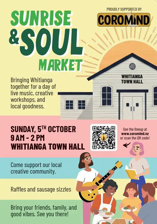Whitianga’s creative spirit will be on full display at the Sunrise & Soul Market, taking place on Sunday, 5 October 2025, from 9 AM to 2 PM at Whitianga Town Hall, proudly supported by Coromind