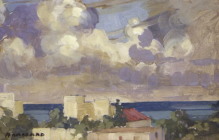 On 16 February 1929, an article in the Hokitika Guardian noted that Miss Rhona Haszard (Mrs Leslie Greener) had held an exhibition of her paintings in December 1928, at Claridge’s Hotel, Alexandria. (6) The article acknowledged her ‘artistic maturity’. Her paintings were landscapes depicting scenes from New Zealand, Brittany, Sark, France and Egypt.