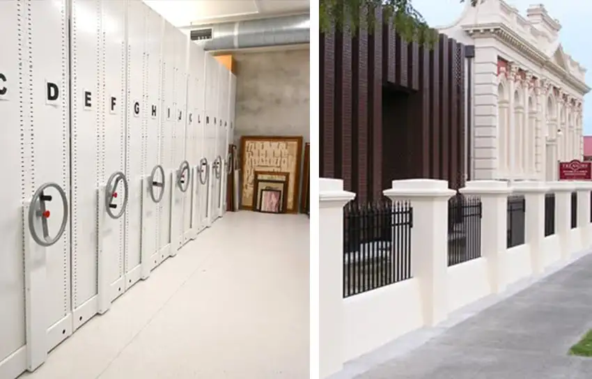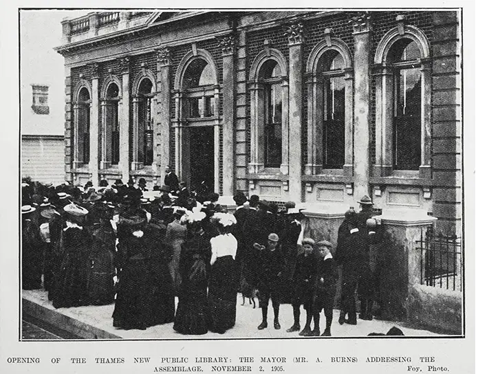 The Treasury is housed within two buildings side by side at 705 Queen Street, Thames, each imposing in their own way and completely juxtaposed architecturally. The Thames Carnegie Library, built in 1905, was refurbished by the council in 2007 and reopened as The Treasury in 2009. Alongside it, the Archive is a bespoke designed, award-winning state of the art facility, stark in its architecture, which respectfully and artistically interprets aspects of the Carnegie Library design.