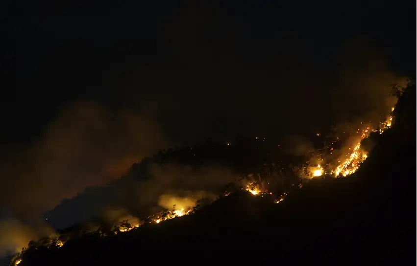 - Remove flammable material and shield yourself from the fire’s heat. If you can’t escape from the fire, do what you can to prepare for it to pass you. Find as clear an area as possible (a road or a clearing is best) and remove as much flammable material as possible from around you. The biggest risk during a wildfire is radiant heat – the extreme heat coming off the fire. Try and shield yourself from the heat by finding a large rock, bank or behind a fallen log. You can also shelter in a hollow in the ground. Drink water and cover your mouth with a damp cloth to protect yourself from the smoke.